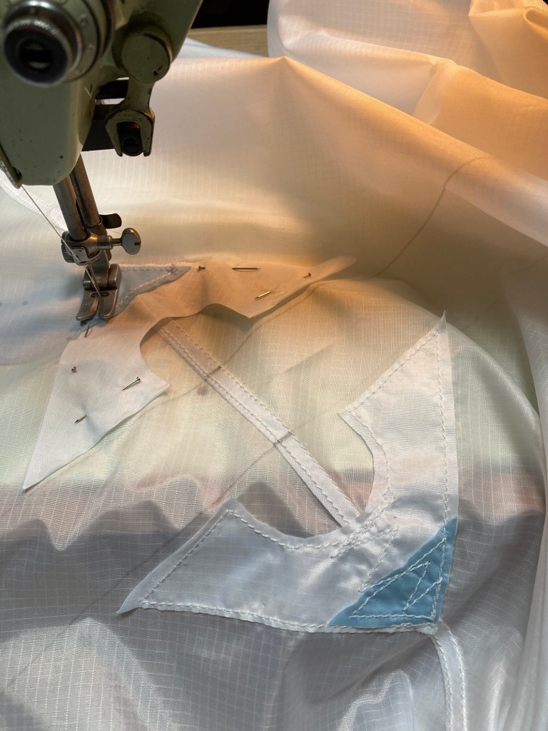 All my kites are entirely handmade, and some take fifty plus hours to sew. My original intention was that to make things achievable I’d have to avoid high tech materials, so set myself the brief that everything had to be made from commonly available materials, so I use ripstop nylon and wooden dowels, polyester thread and string, cheapest liquid superglue and ‘araldite’ type epoxy glues. The scale of the biggest has tested the limits of what’s possible, and I have begun to use glassfibre tubes as spars for these.